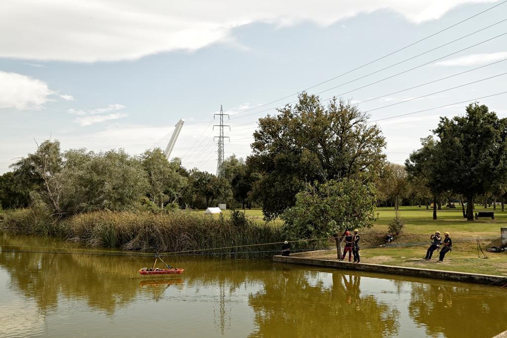 Evacuaci贸 mitjan莽ant pont聽grua聽en una simulaci贸聽d’inundaci贸,聽Puente聽del Alamillo. 漏 Curro聽Martinez,聽KORDA’S